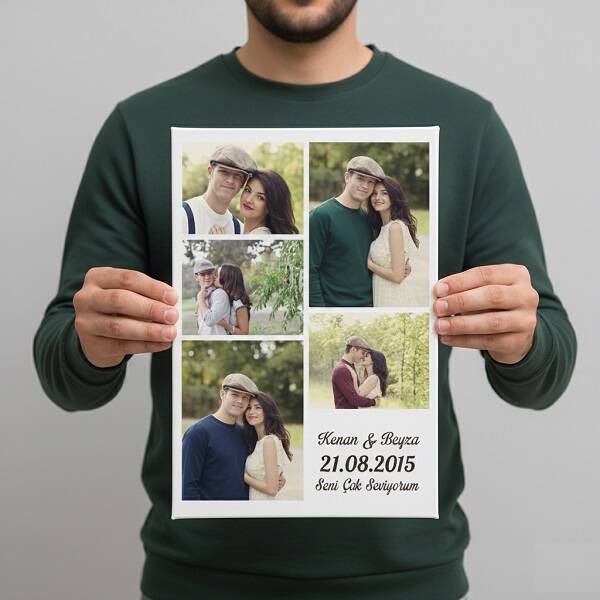 Yıldönümünüzde sevgilinize, fotoğraflarınızla hazırlanacak ve üzerine mesajınızla birlikte yıldönümü tarihinizin yazılacağı şık bir kanvas tablo hediye etmeye ne dersiniz? Bize göndereceğiniz 5 fotoğrafınızla hazırlanacak olan Kişiye Özel Yıldönümü Kanvas Tablo ile sevgilinize sürprizlerin en güzelini, en romantiğini yapabilirsiniz. Duvarlarınıza renk katacak olan Size Özel Yıldönümü Tablosu sadece Hediyemen.com'da.