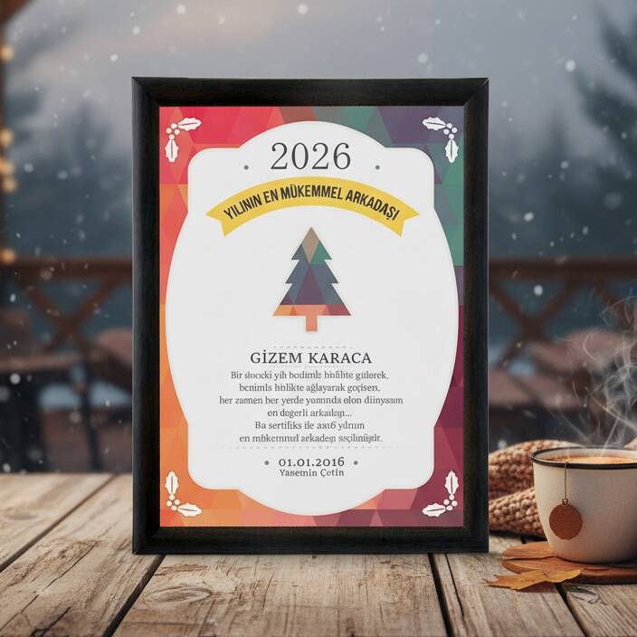 2 -) Kişiye Özel Yılın En Arkadaşı Sertifikası siyah ahşap ile çerçevelenmiştir. Ürünü, duvara asılabileceği gibi, destek ayağı sayesinde masa üzerinde de sergilenebilmektedir.