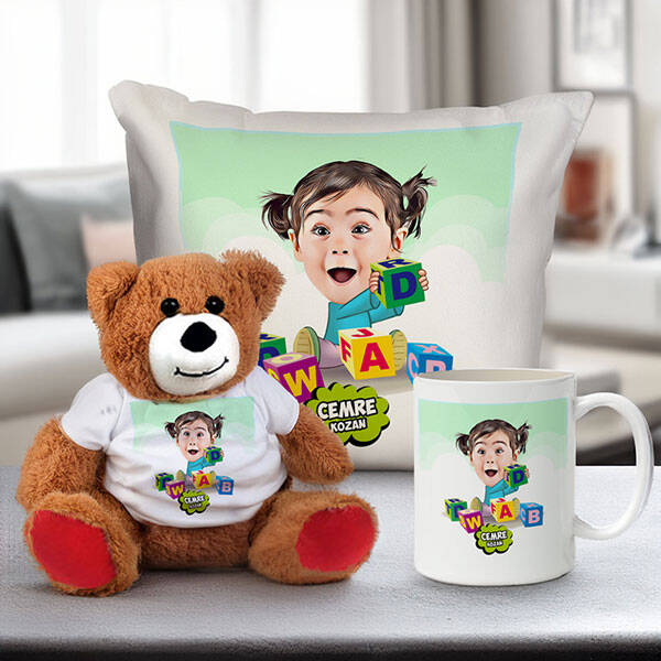 Önünde harf kutucuklar bulunan ve neşeli tavırları olan karikatür tasarımlı bu hediye seti tamamen kızınıza özel olarak hazırlanıyor. Çocuğunuzun doğum gününü daha da özel kılmak için, bu sevimli hediyeyi tercih edebilirsiniz. Karikatürlü yastık, birinci sınıf saten kumaştan üretilmiş olup, canlı ve kaliteli baskısıyla dikkat çeker. Bu yastık, çocuğunuzun odasının en gözde aksesuarı olacaktır. Pelüş oyuncak ayıcık ise, üzerinde çocuğunuzun karikatür baskılı tişörtü ile sevimliliğini bir kat daha artırır ve çocuğunuzun en yakın arkadaşı olur.